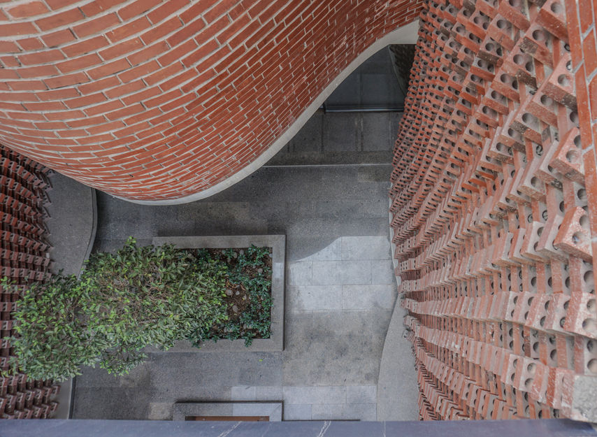 The Concrete building mass is steered and sliced by three vertical planes strategically to attain relief spaces at the front –double height RECEPTION, Ground floor and at the center –Courtyard, First floor, revealing the inner flesh of the building which breathes through exposed brick jalis. [/